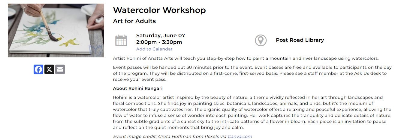 "We were thrilled to host Rohini's watercolor painting workshop at Vinings Library. Her passion for art and teaching created an engaging and inspiring experience for participants of all skill levels. Rohini’s ability to break down techniques and encourage creativity left a lasting impression on our community. We are incredibly grateful for her generosity in offering this workshop and look forward to collaborating with her again in the future!"