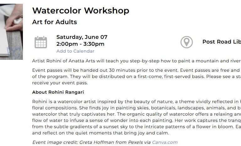 "Rohini held a watercolor workshop for us here at Switzer Library and it was fantastic! Rohini came very prepared and was very gracious when there were some hiccups on the library's end. All of the participants had so much fun and were all able to leave with a beautiful painting! We are extremely grateful for Rohini's time and knowledge that allowed us to host this program and we would gladly work with her again"